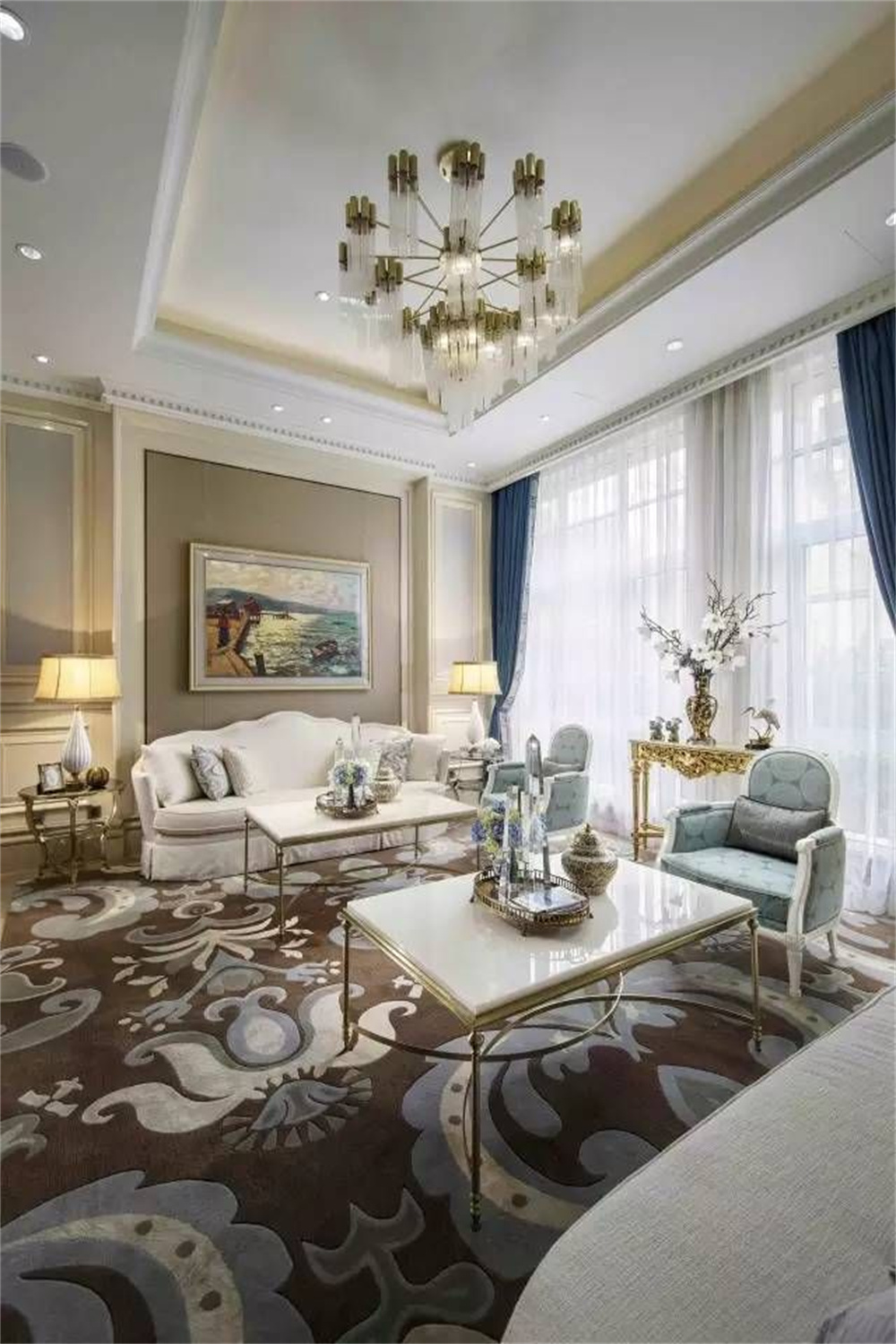 整個空間陳設注重氣質,留意精神世界。室内一共三層(céng),以中軸線對稱布局。迎賓(bīn)大廳作爲售樓處的第一空間,由一扇藝術浮雕屏風虛掩而入。拱頂、水晶吊燈與優雅的家俱陳設,凝聚法國古典與當代美藝精華。現代法式花藝與藝術飾品随處可見,與法國建築的曆史元素相輔相成,與精緻内飾通融契合。