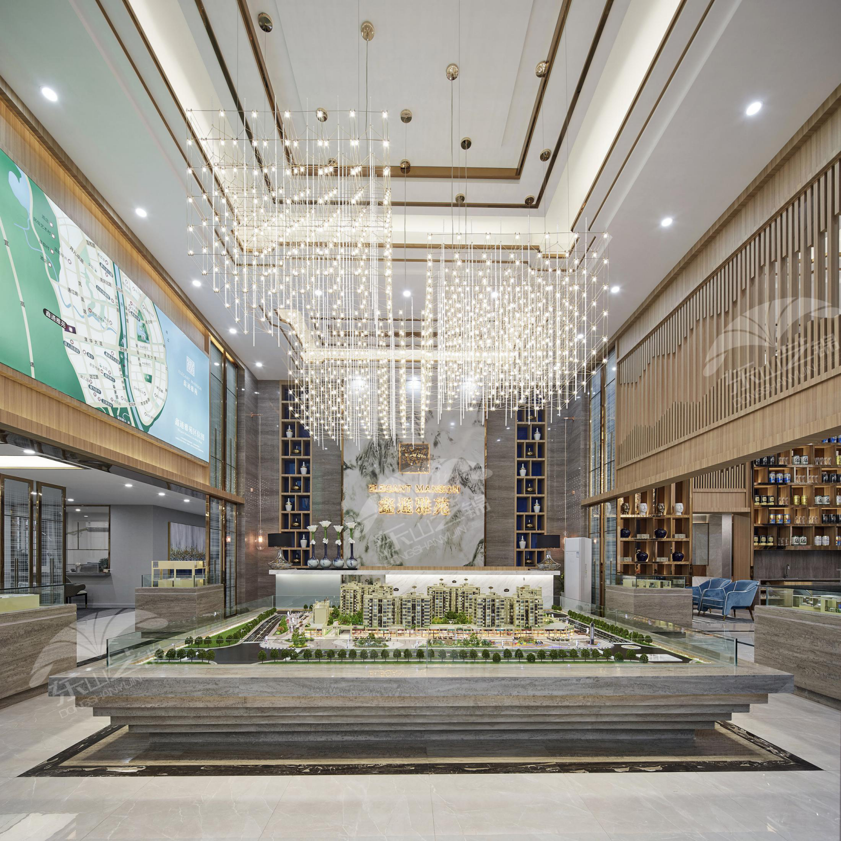 設計(jì)者在滿足銷售大廳的功能上,中間部位設計(jì)瞭(le)沙盤展示區、洽談區。二者相互共享又互不幹(gàn)涉,合理利用瞭(le)空間。沙盤展示設立在中央顯眼的位置,服務台造型簡約,利用金屬镂空設計隔擋(dǎng),簡單(dān)又不失穩重。