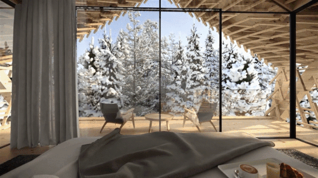 建築設計回應瞭(le)當地的鄉土建築,輕盈的外觀設計與自然坡度屋頂喚起瞭(le)自然的詩意。套房面積從60至80平,大面積的落地玻璃,在寒冷的冬季可以欣賞到白雪皚(ái)皚(ái)的壯美景象,夏天還能觀星賞月。